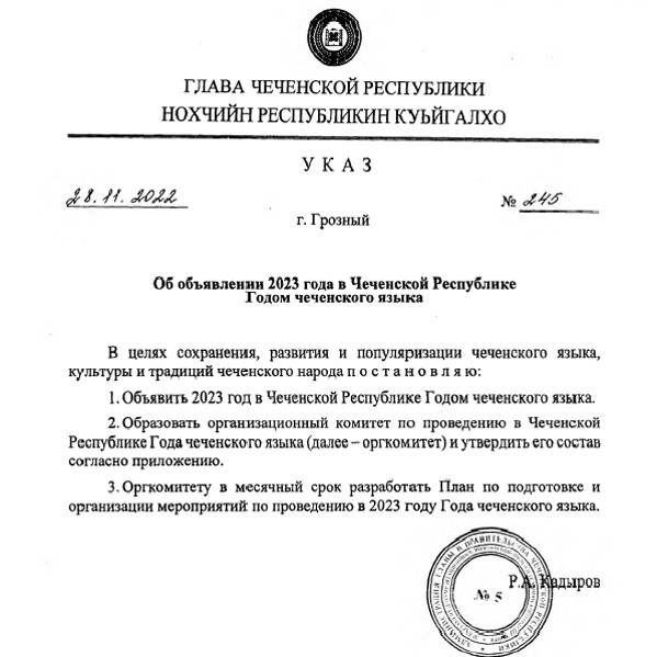 12.01.2023"В целях сохранения, развития и популяризации чеченского языка, культуры и традиций чеченского народа постановляю: объявить 2023 год в ЧР Годом чеченского языка, образовать организационный комитет по проведению в ЧР Года чеченского языка...", - сообщается в Указе.