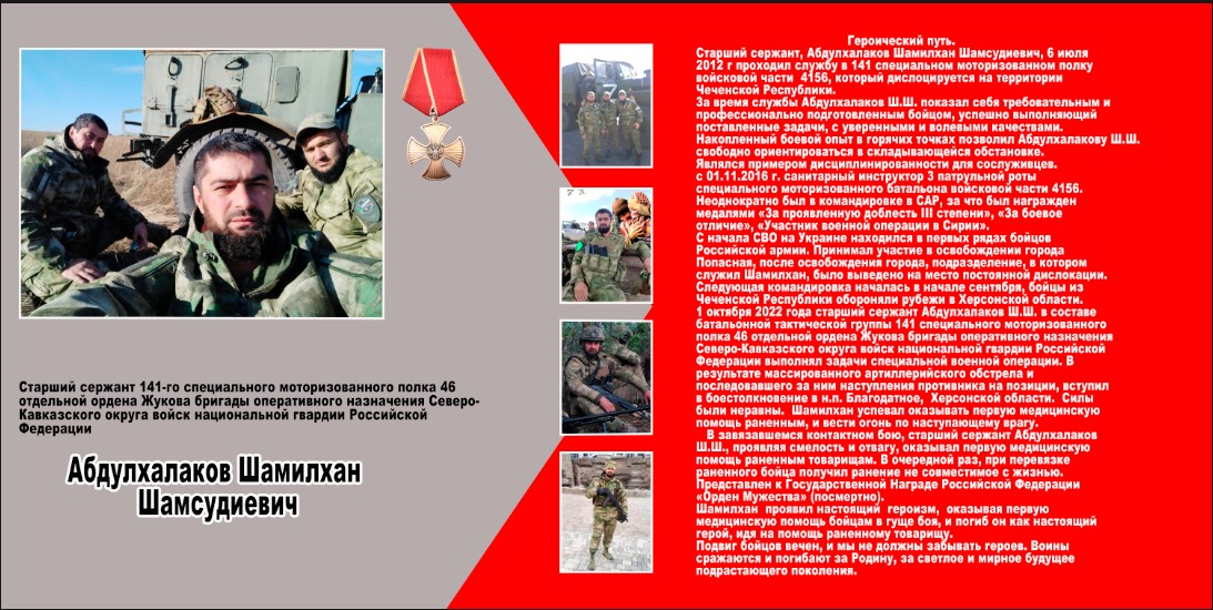 Старший сержант, Абдулхалаков Шамилхан Шамсудиевич, 6 июля 2012 г. проходил службу в 141 специальном моторизованном полку войсковой части 4156, который дислоцируется на территории Чеченской Республики.