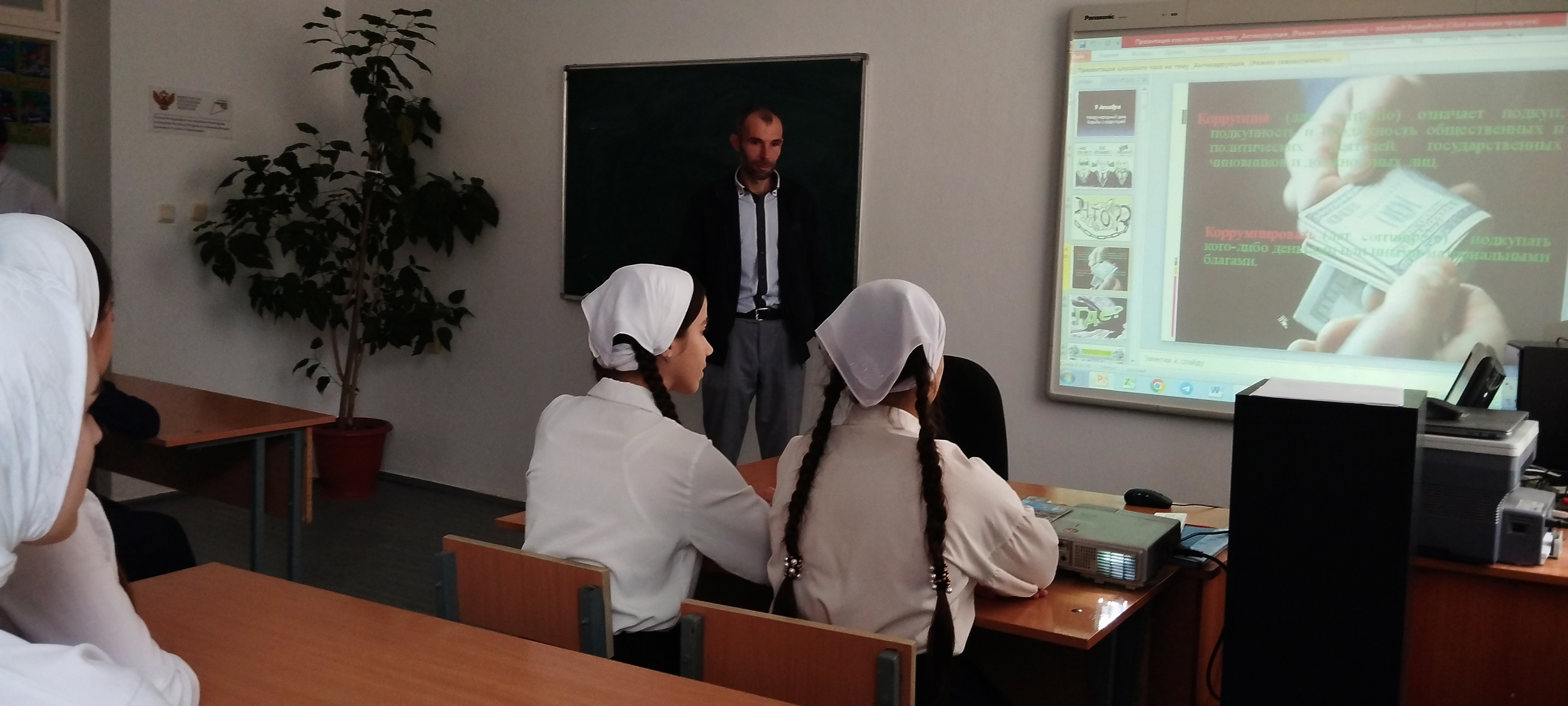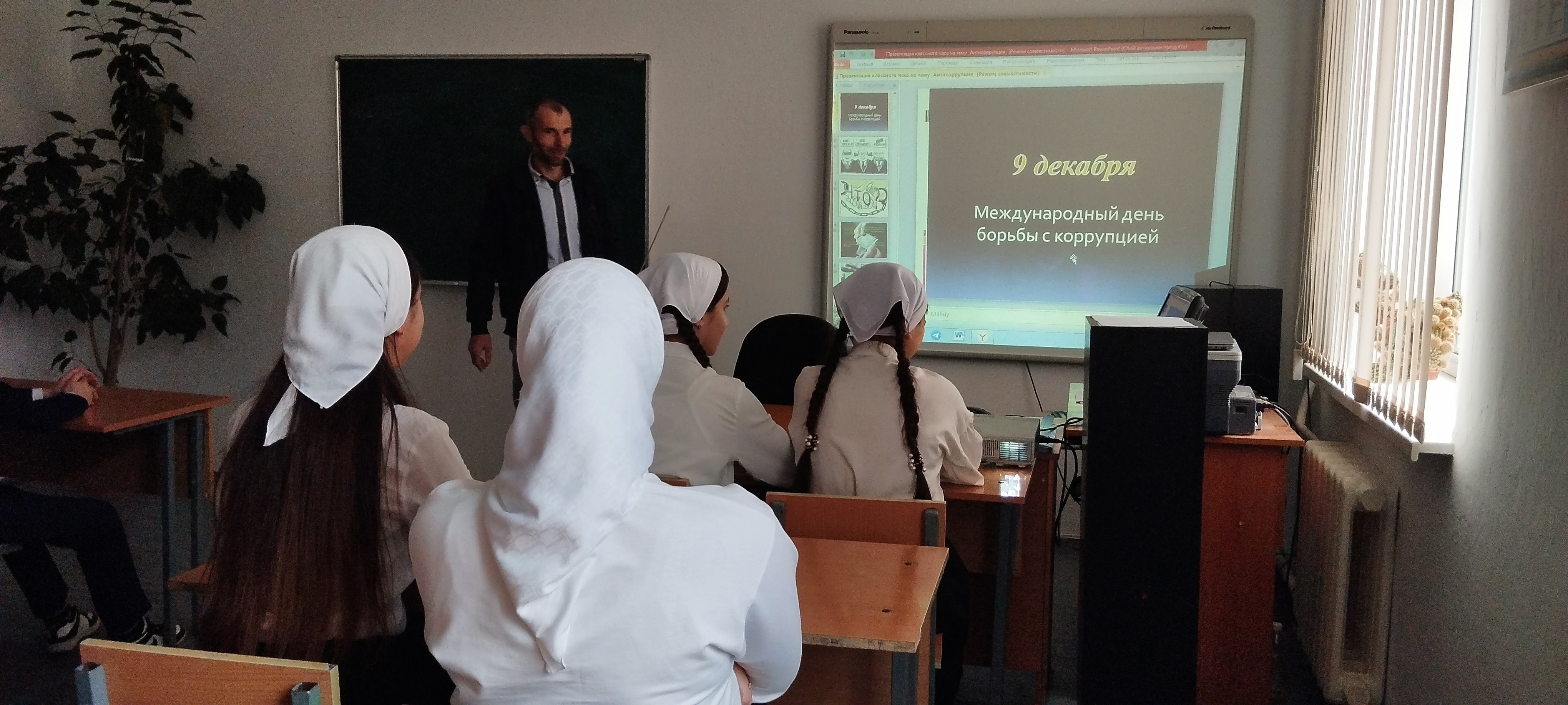 04.12.202304.12.2023г. заместитель директора по УВР, Алхазуров З.И. провел открытое классное занятие с обучающимися 9-11 классов на тему: «9 декабря – Международный день борьбы с коррупцией».