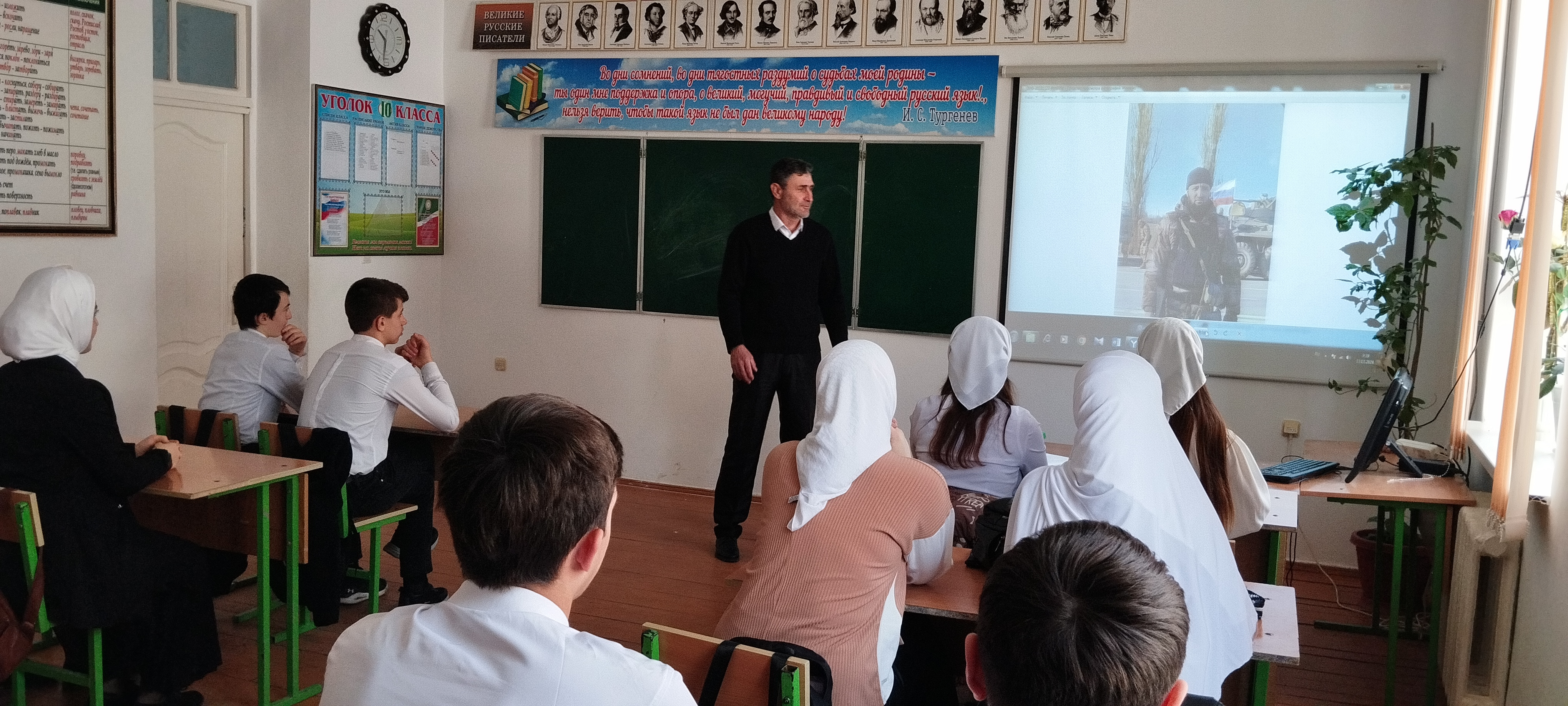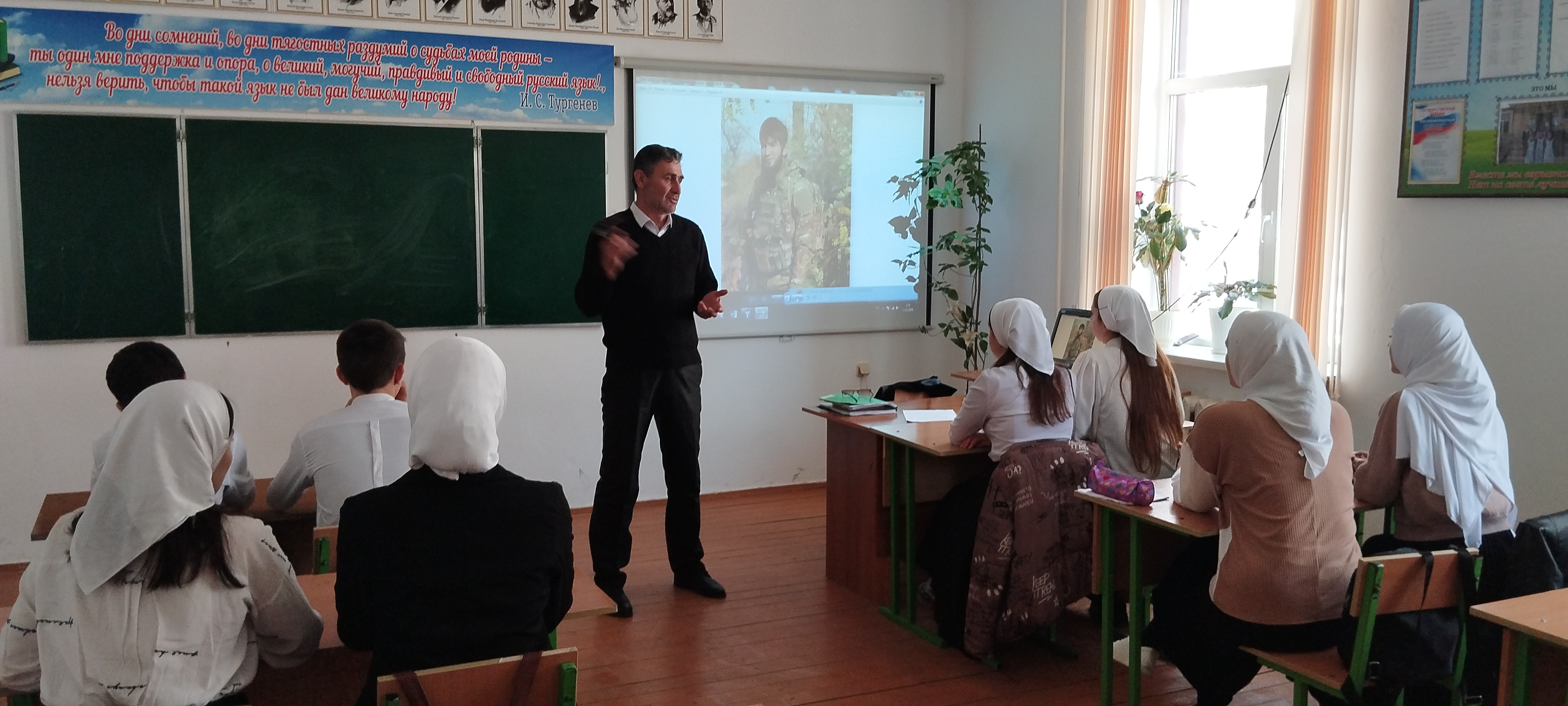 Уже два года воины из разных уголков России участвуют в специальной военной операции, самоотверженно защищая интересы нашей страны. В рядах бойцов много наших земляков, среди которых есть и выпускники нашей школы. Россия всегда славилась своими героями, которые, не задумываясь, вставали на защиту своей Родины и ее интересов. Каждому из нас важно знать своих героев, реальных участников СВО, их более 20 ти наших выпускников. На конкретном примере обучающиеся увидели, что настоящие Герои живут рядом, что мужество, храбрость, любовь к Родине – качества настоящего человека, патриота и гражданина своей страны. В конце беседы прочитали дуа в память павших в бою воинов, которые отдали свою жизнь за Отечество. А тем, кто сегодня служит в зоне спецоперации, мы желаем удачи в бою, крепкого здоровья! Мы гордимся вами! Поскорее возвращайтесь домой с победой, наши герои!