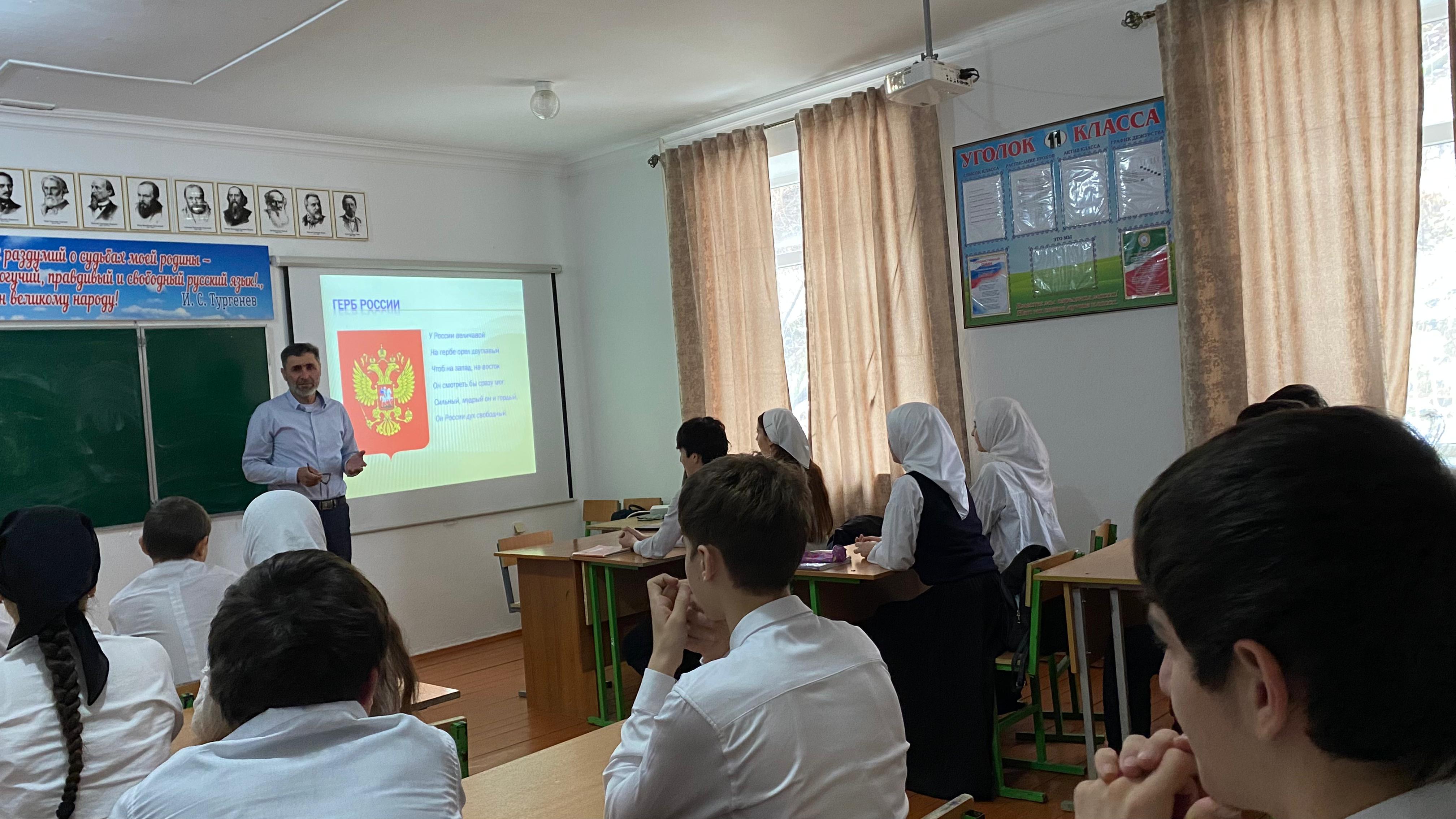 28.11.2024г. заместитель директора по ВР Алимгериев Р.М. провел беседу с обучающимися 9-11 классов на тему: "История Российского герба".