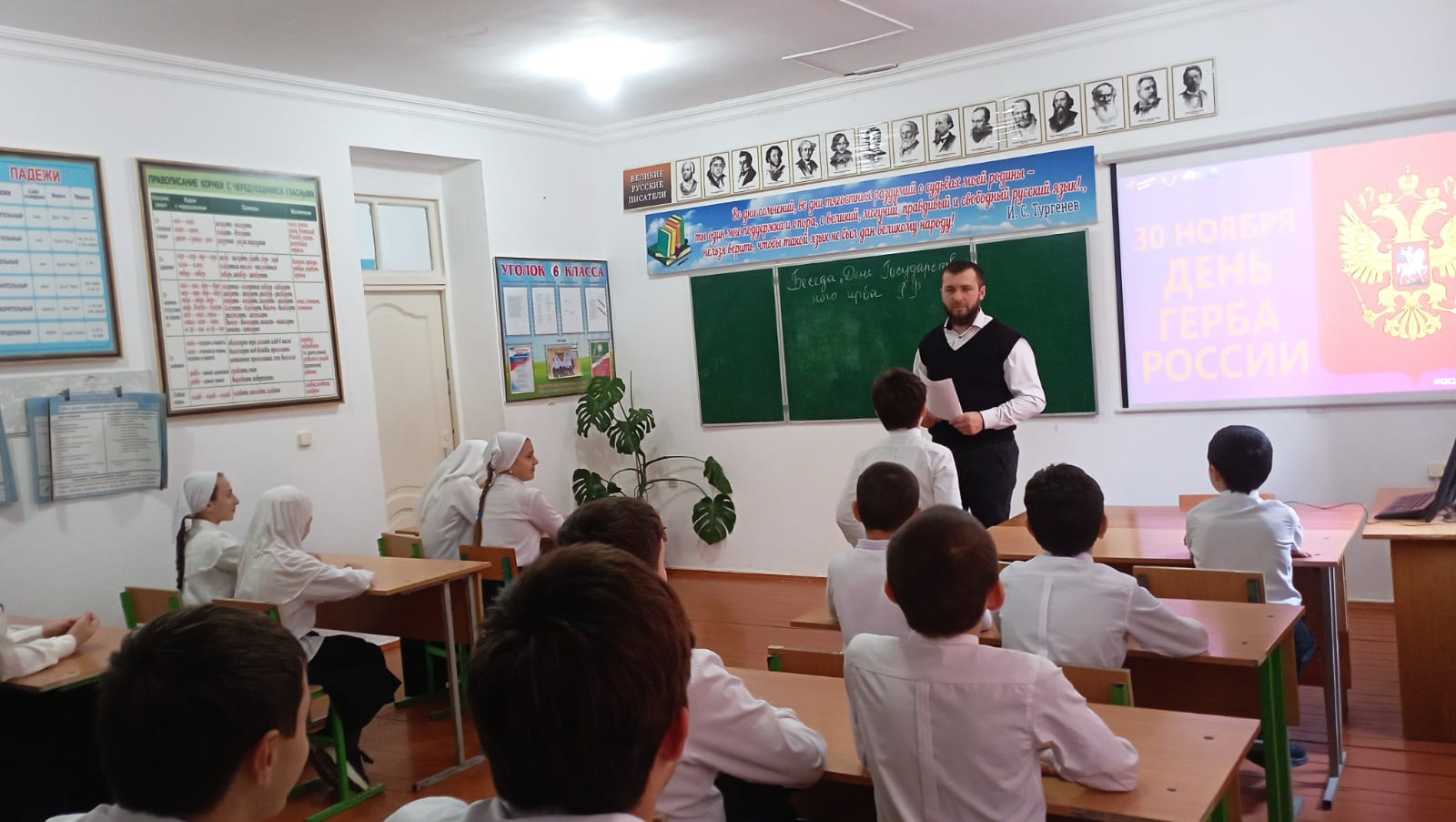 26.11.2024г. советник директора по воспитанию Жантуев Л.Г. провел беседу с обучающимися 5 класса на тему: "Герб нашей страны"