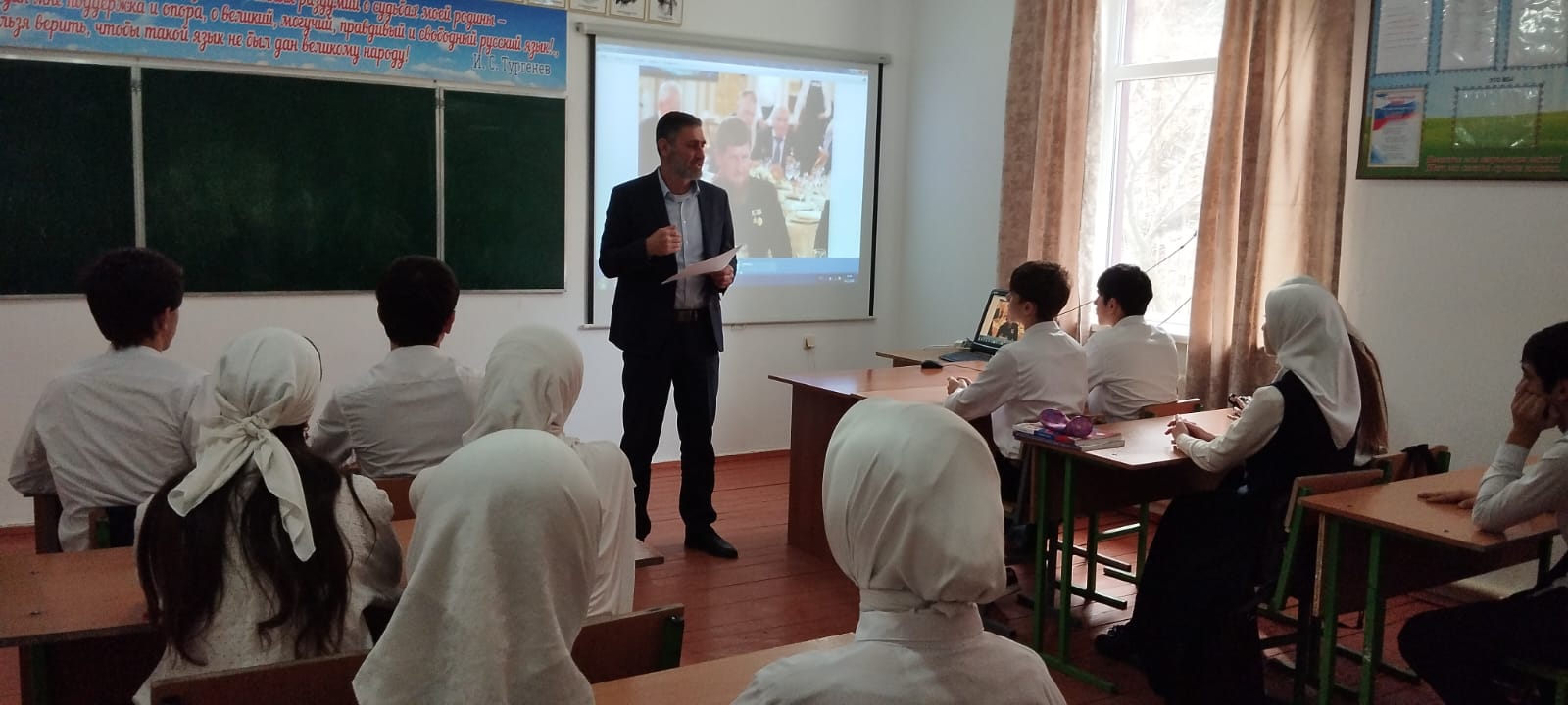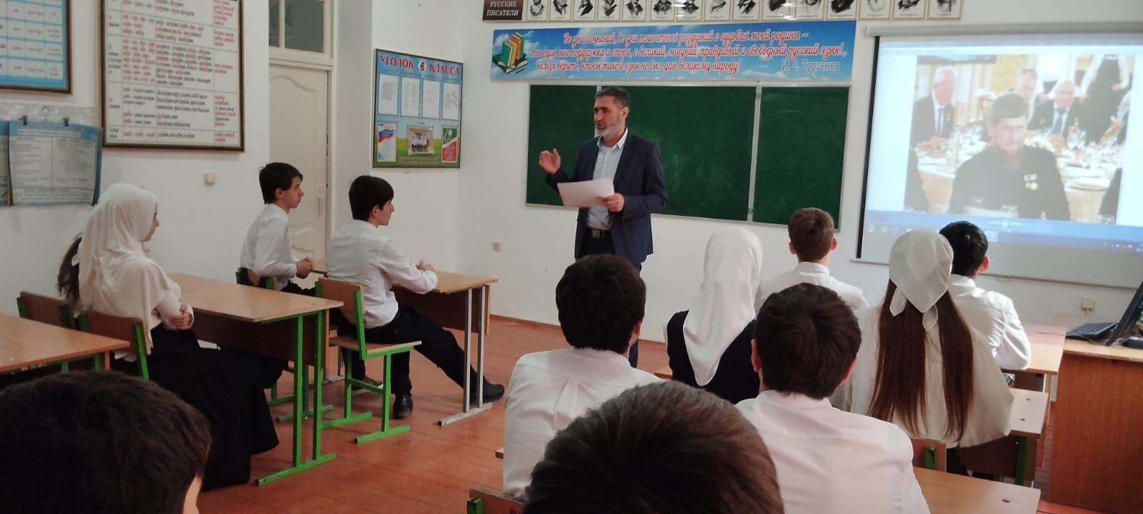 04.12.2024г. заместитель директора по ВР Алимгериев Р.М., провел беседу с обучающимися 9-11 кл. на тему: «Наш герой-Р.А.Кадыров»