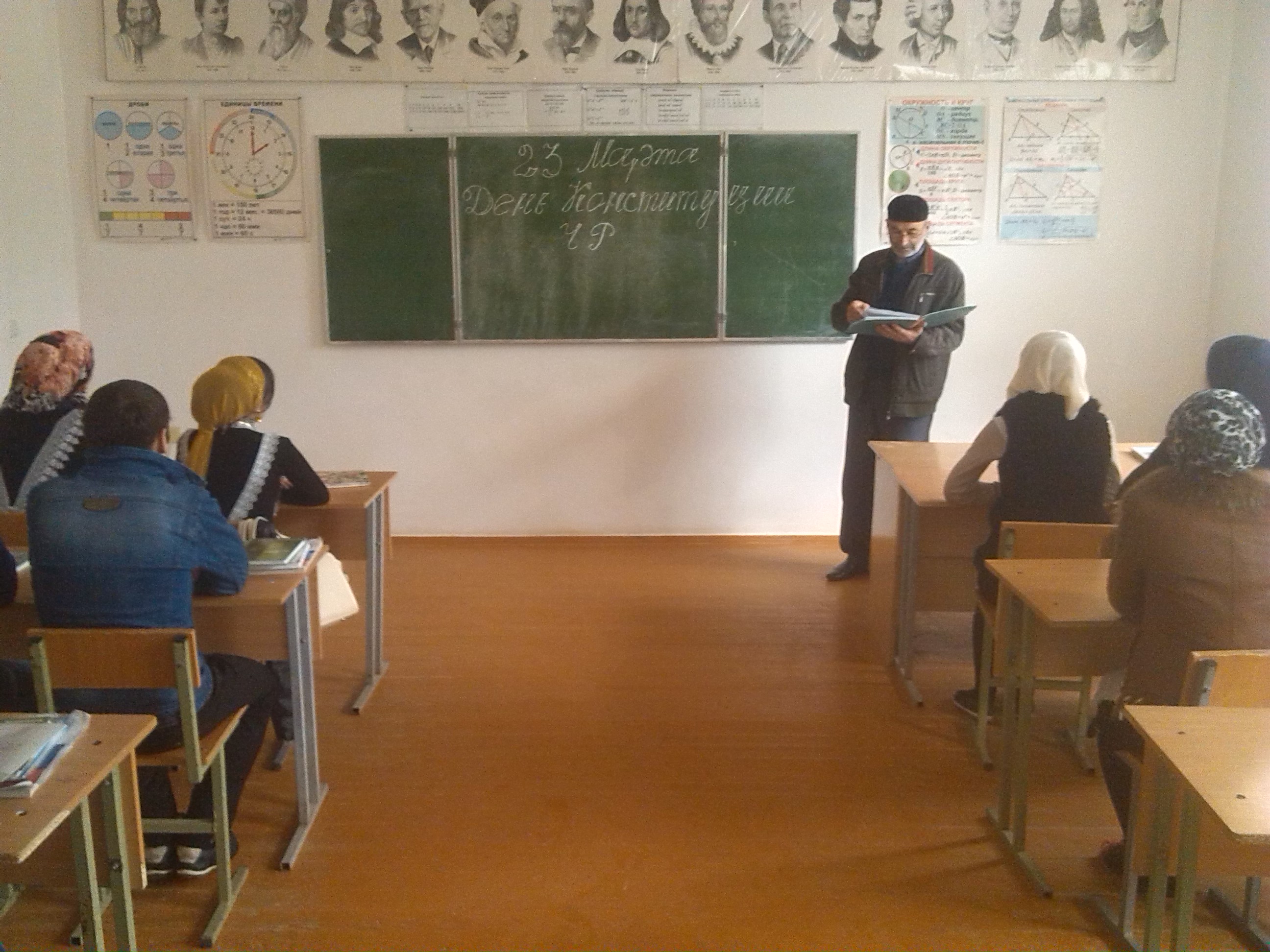21.03.2016С 16 по 21 марта 2016 года в МБОУ «СОШ с. Татай-Хутор» проводились мероприятия, посвященные Дню Конституции ЧР. Здание школы было празднично оформлено баннером. С 16 по 21 марта классные руководители провели классные часы по темам: «День Конституции ЧР», «Закон мира и добра», «Государственные символы ЧР-герб, флаг, гимн».