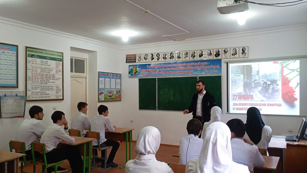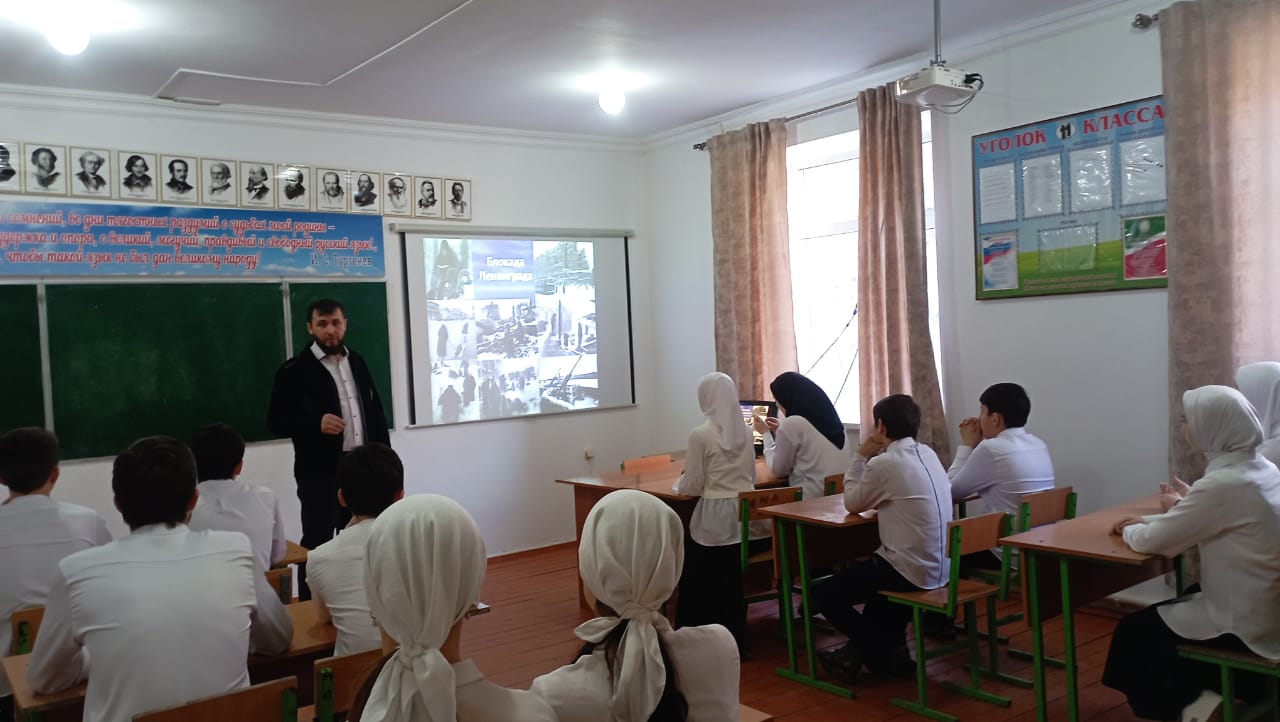 22.01.2025г. советник директора по воспитанию Жантуев Л.Г. провел беседу с презентацией с обучающимися 9, 11 классов на тему: "Блокадный Ленинград".