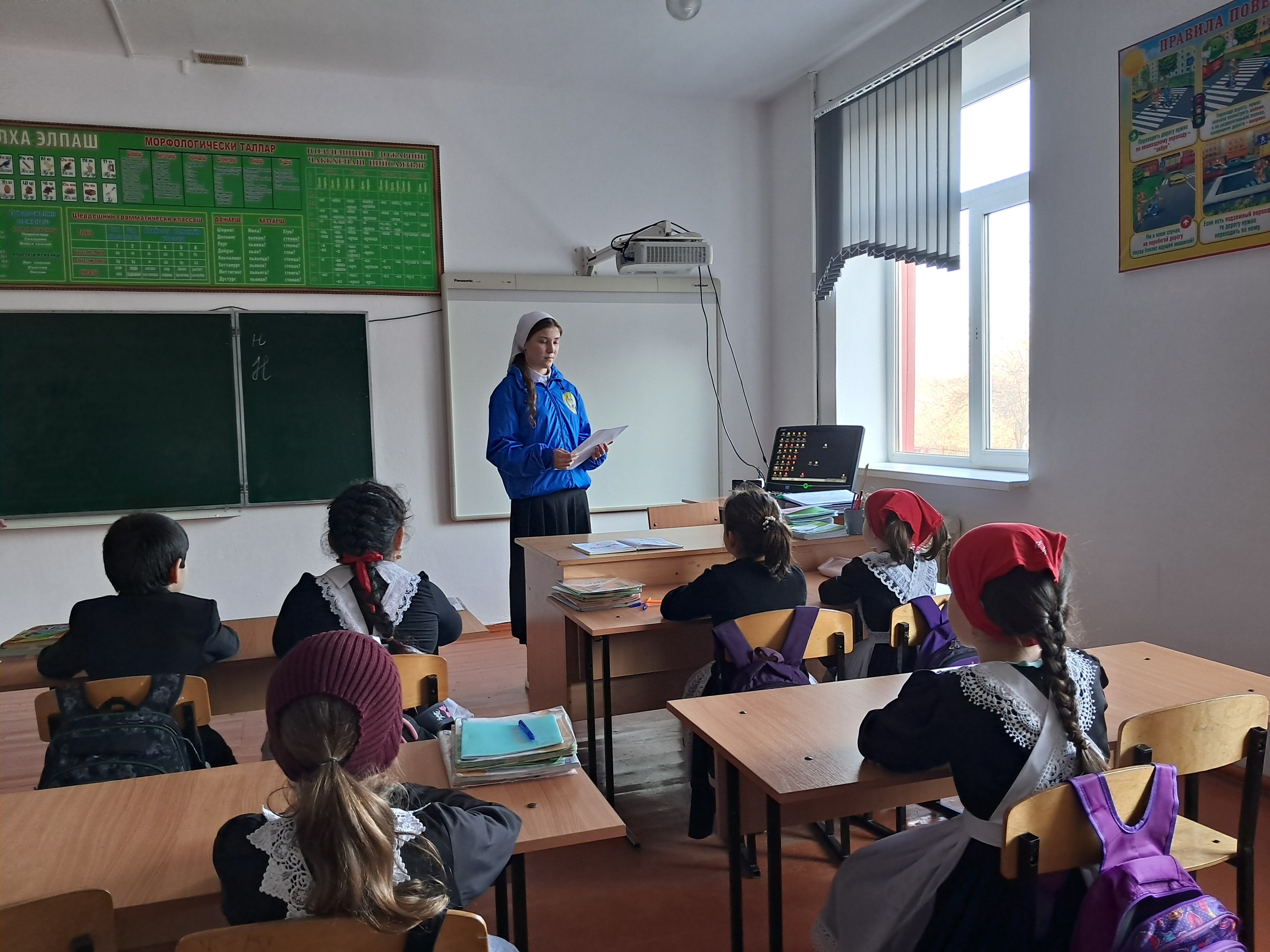 10.11.2025г., члены отряда "Юные Кадыровцы" провели беседу с обучающимися 1 класса на тему: "Правила поведения в школе"